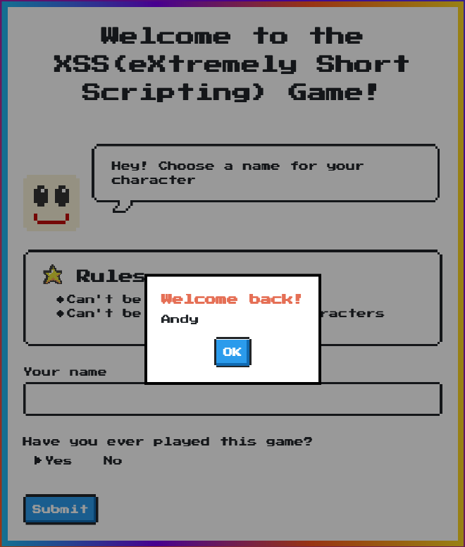 The page has a form with a name input and a toggle. The instruction says the name cannot be empty nor can it be longer than 24 characters. Let’s try it. Enting the name will trigger a dialog popup with the name from the input field.